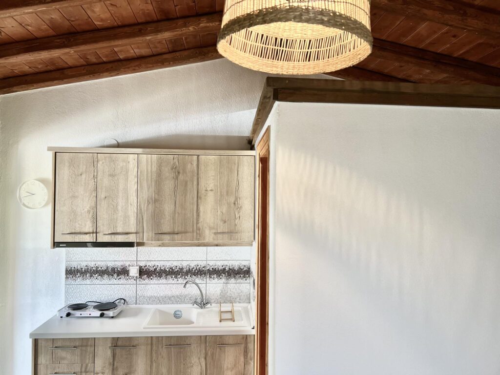 Το δωμάτιο διαθέτει επίσης κουζίνα με όλο τον απαραίτητο εξοπλισμό, ηλεκτρικό φούρνο, μαγειρικές εστίες και μεγάλο ψυγείο.